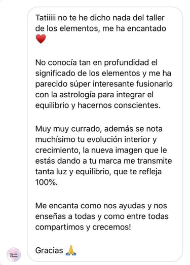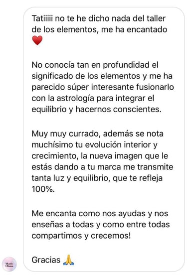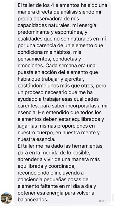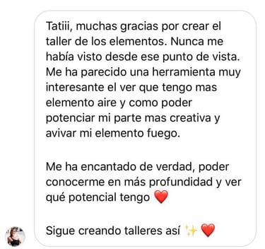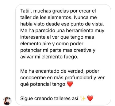 El propósito principal del taller de LOS 4 ELEMENTOS es el autoconocimiento, que me parece básico, para saber dar los pasos alineados con tu esencia. Cuando crees que has tomado una mala decisión a la hora de elegir un trabajo o una relación, no es "mala" es una decisión que no está en ese momento alineada contigo y hasta que no la transitas no eres consciente de que en ese lugar no te corresponde estar, porque ahí no puedes ser TÚ. Estamos en constante evolución y trabajar el autoconocimiento es un ejercicio indispensable en nuestra vida.